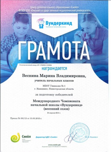 Грамота за подготовку победителей Международного Чемпионата начальной школы "Вундеркинд", 2015 год