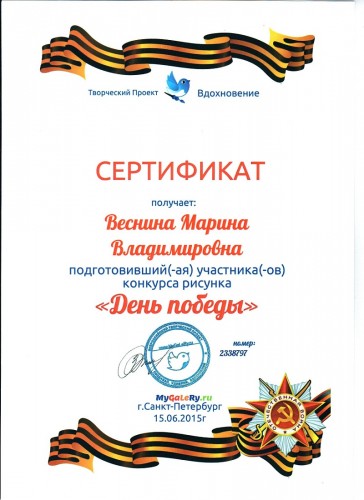 Сертификат за подготовку участников конкурса рисунков "День Победы", 2015 год