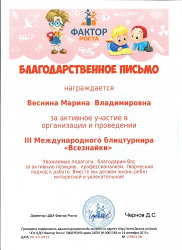 Благодарственное письмо за активное участие в организации и проведении III Международного блицтурнира "Всезнайки", 2015 год