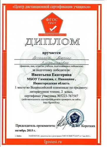 Диплом за подготовку победителя Ивентьевой Екатерины во Всероссийской олимпиаде по литературному чтению, 2015 год