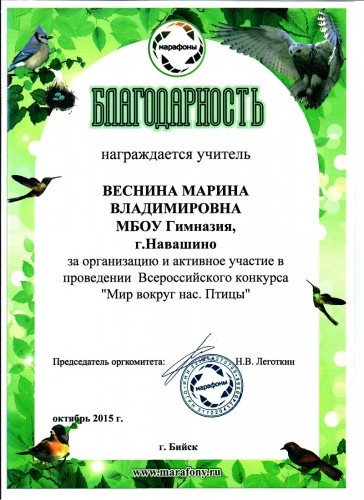 Благодарность за организацию и активное участие в проведении Всероссийского конкурса "Мир вокруг нас. Птицы", 2015 год