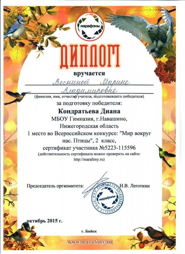 Диплом за подготовку победителя Кондратьевой Дианы во Всероссийском конкурсе "Мир вокруг нас. Птицы", 2015 год