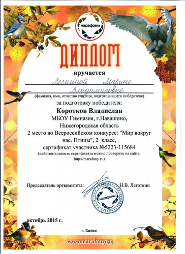 иплом за подготовку победителя Короткова Владислава во Всероссийском конкурсе "Мир вокруг нас. Птицы", 2015 год