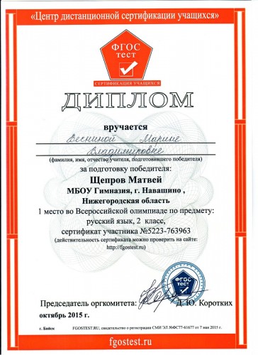 Диплом за подготовку победителя Щепрова Матвея во Всероссийской олимпиаде по русскому языку, 2015 год