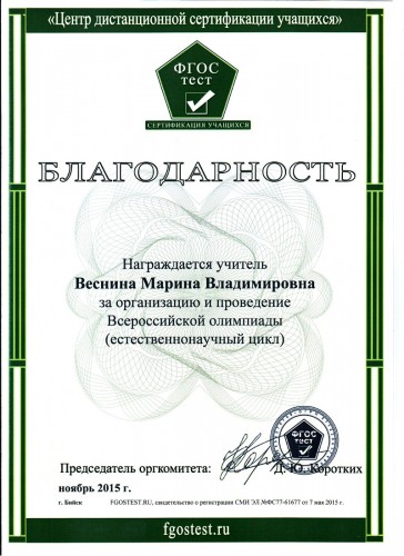 Благодарность за организацию и проведение Всероссийской олимпиады (естественнонаучный цикл), 2015 год