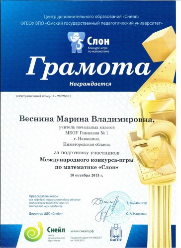 Грамота за подготовку участников участников Международного конкурса - игры "Слон", 2013 год