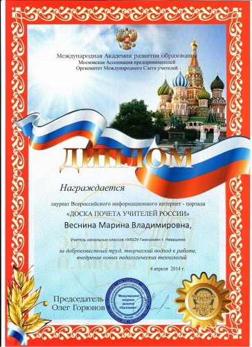 диплом лауреата Всероссийского информационного интернет-портала "Доска учителей России", 2014 год