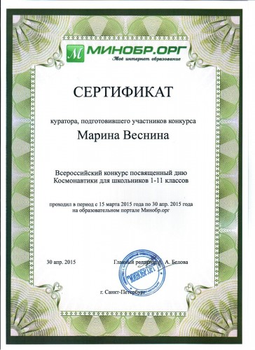 Сертификат куратора Всероссийского конкурса ко Дню Космонавтики, 2015 год