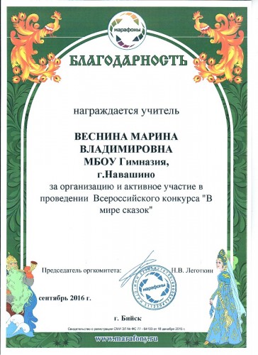 Благодарность за организацию и активное участие в проведении Всероссийского конкурса "В мире сказок", 2016 год