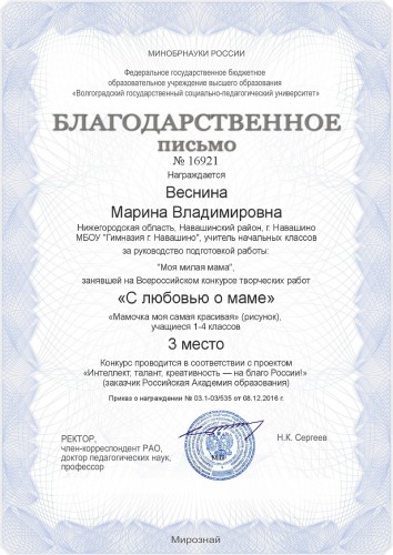 Благодарственное письмо за руководство подготовкой работы "Моя милая мама"на Всероссийском конкурсе творческих работ "С любовью о маме", 2016 год