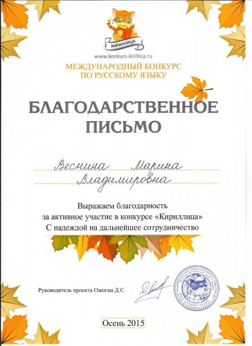 Благодарственное письмо за активное участие в конкурсе "Кириллица", 2015 год