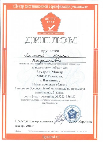 Диплом за подготовку победителя во Всероссийской олимпиаде по математике, 2015 год