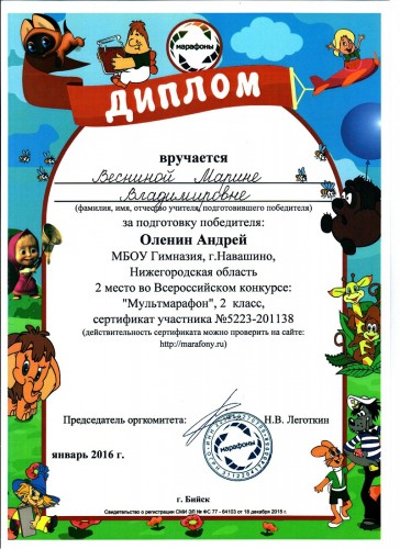 Диплом за подготовку победителя Оленина Андрея во Всероссийском конкурсе "Мультмарафон", 2016 год