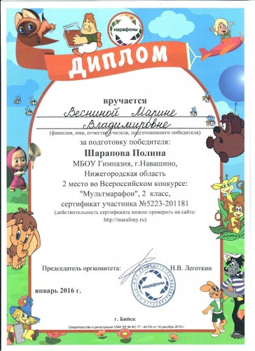 Диплом за подготовку победителя Шарапова Полина во Всероссийском конкурсе "Мультмарафон", 2016 год