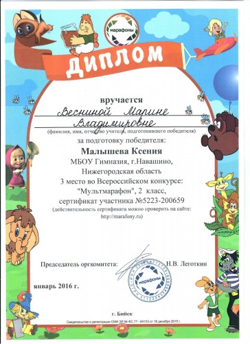 Диплом за подготовку победителя Малышева Ксения во Всероссийском конкурсе "Мультмарафон", 2016 год