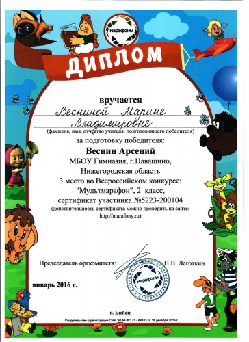 Диплом за подготовку победителя Веснина Арсения во Всероссийском конкурсе "Мультмарафон", 2016 год