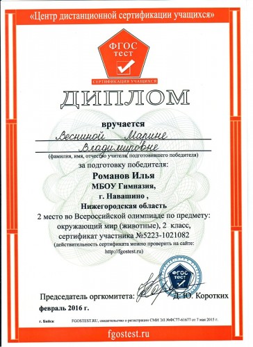 Диплом за подготовку победителя Романова Ильи во Всероссийской олимпиаде по окружающему миру (животные)", 2016 год