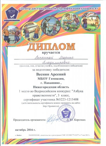 Диплом за подготовку победителяВеснина Арсения во Всероссийском конкурсе "Азбука нравственности", 2016 год