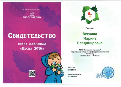 Свидетельство о подготовке победителей мероприятия "русский язык", 2016 год