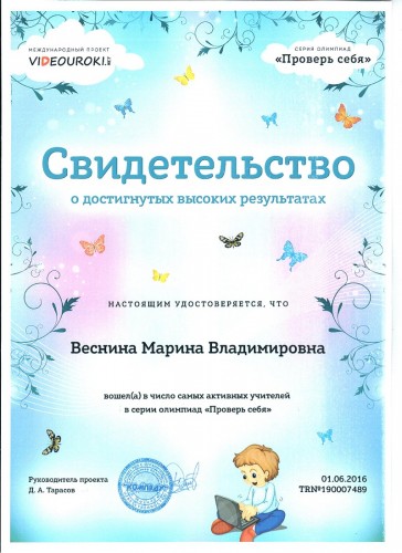 Свидетельство о достигнутых высоких результатах в серии олимпиад "Проверь себя", 2016 год
