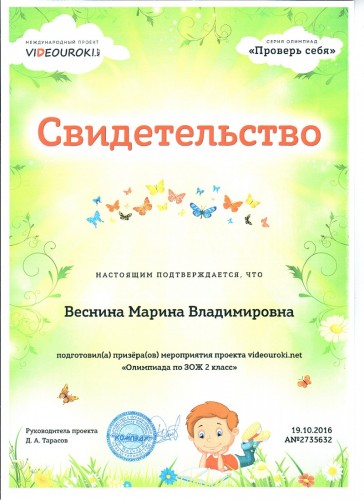 Свидетельство за подготовку призеров мероприятия "Олимпиада по ЗОЖ", 2016 год